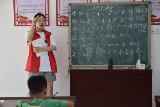 说普通话,写规范字。头雁实践队开展了“书正语纯·推普润心”暑期学堂。从最基本的部首开始,头雁实践队成员一笔一划地示范着字形的构造,从横平竖直到撇捺舒展,激发了同学们对汉字结构的好奇与喜爱,让小朋友们在书法中领会到不仅要学好普通话,更要写好中国字。